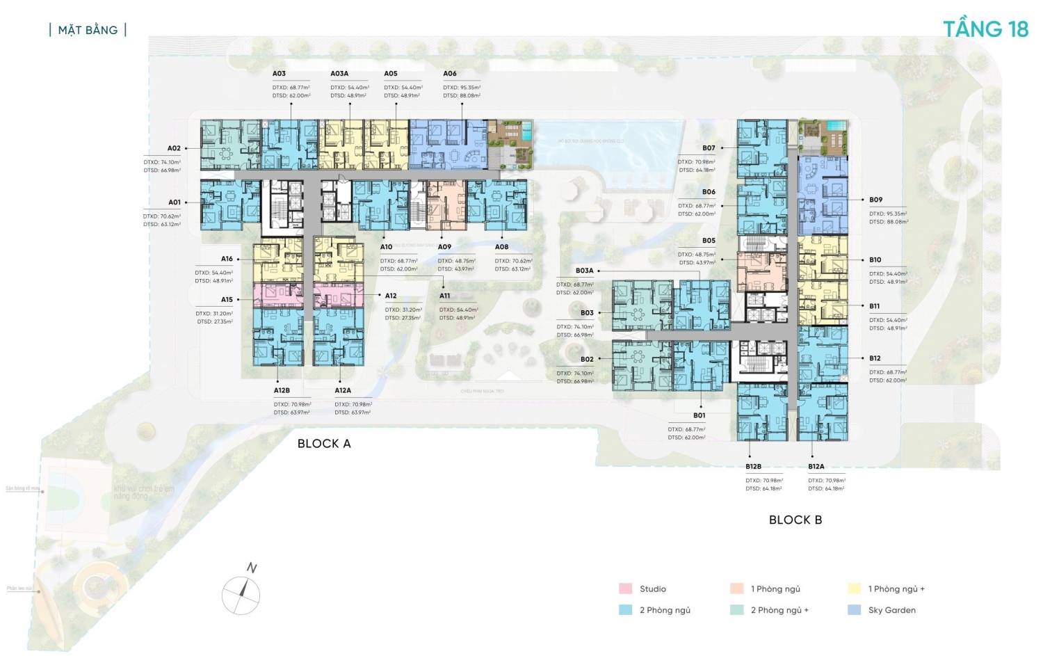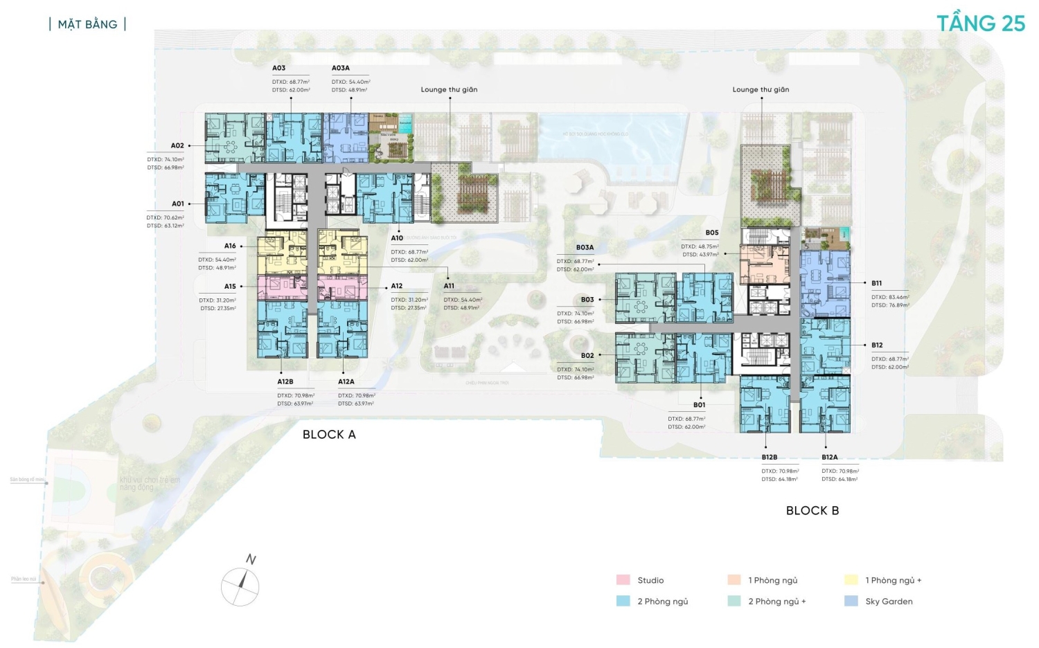 | Diện tích chi tiết | – Studio: 52 căn (30m2) – 1pn: 168 căn (48-54m2) – 2pn: 405 căn (65-75m2) – 3pn: 15 căn (80m2) – Sky garden: 10 căn (80-130m2, kể cả sân vườn) |
