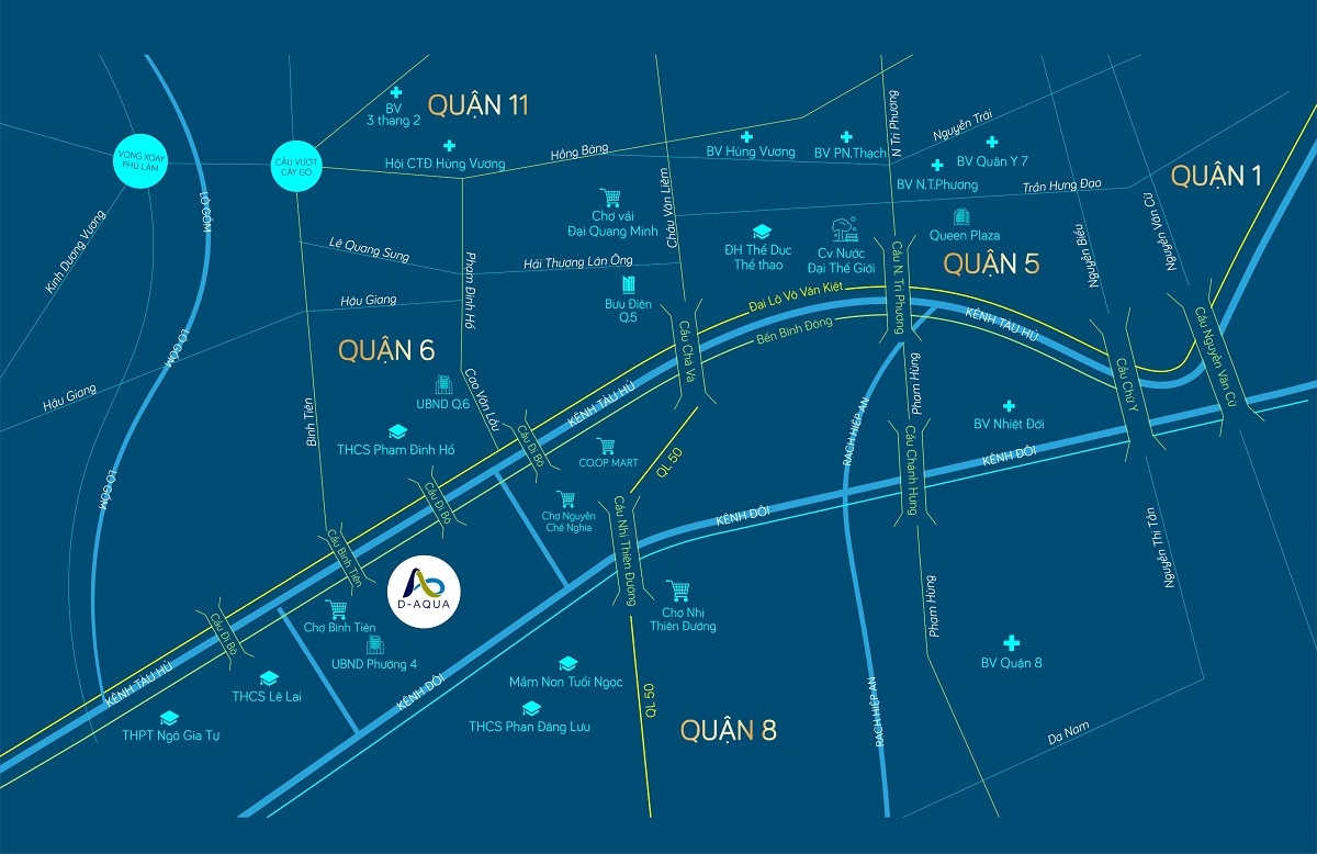 Dự án D Aqua sở hữu địa thế hiếm có, tọa lạc trên mặt tiền Bến Bình Đông, vị trí vàng trung tâm Quận 8 với 125m bờ sông vượng khí. Từ dự án, cư dân có thể dễ dàng di chuyển đến các khu vực trọng điểm nội đô cũng như tiếp cận với nhiều tiện ích ngoại khu đa dạng, vượt trội trong cự ly gần.