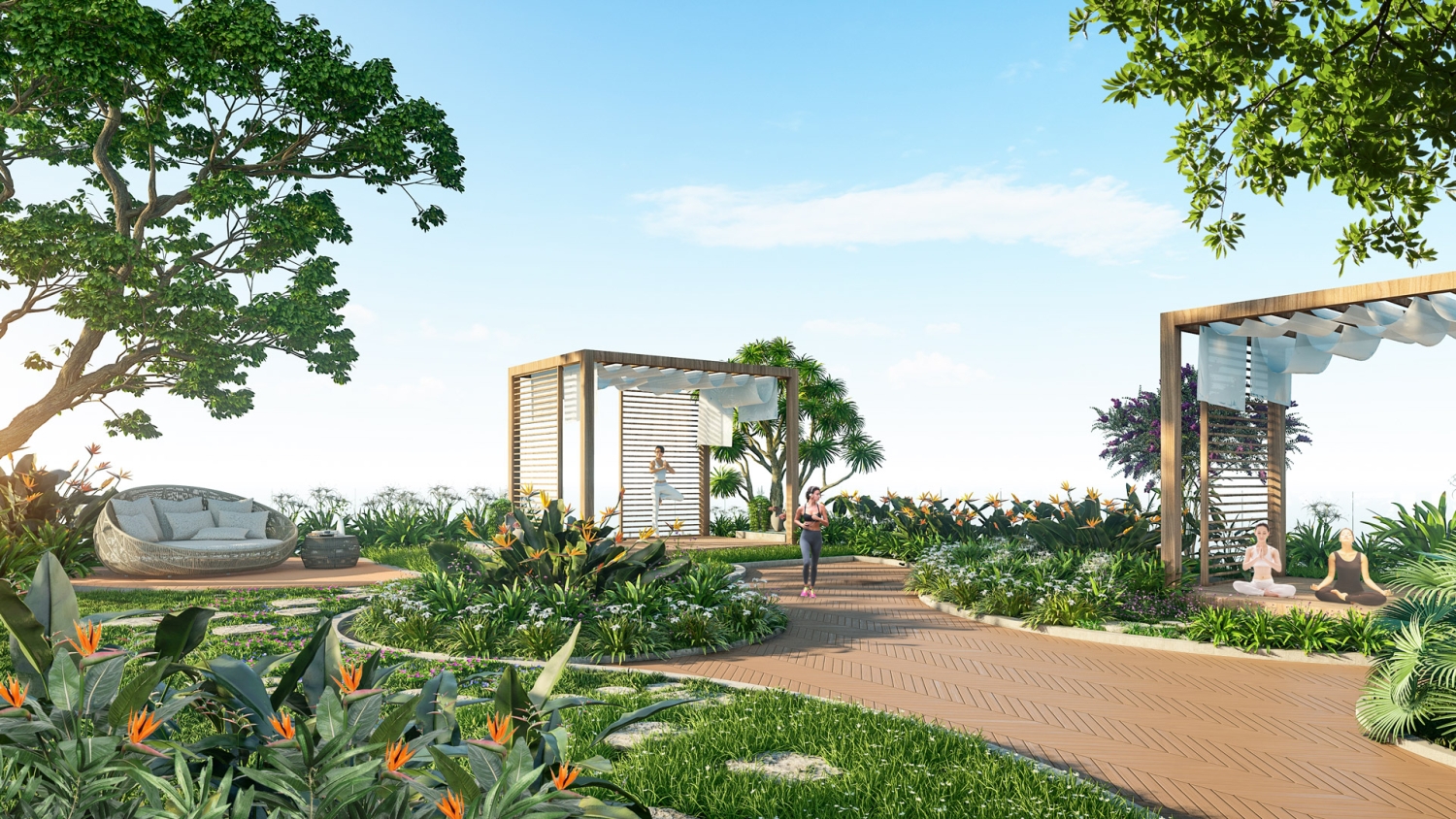 Suối cảnh quan xanh mát: Đây được xem là điểm nhấn ấn tượng trong quy hoạch thiết kế. Dòng suối không chỉ có chức năng kết hợp 2 tòa tháp, mà còn tạo nên vùng lõi thiên nhiên mát lành, góp phần làm giảm tiết trời oi ả của Sài Gòn nắng nóng.