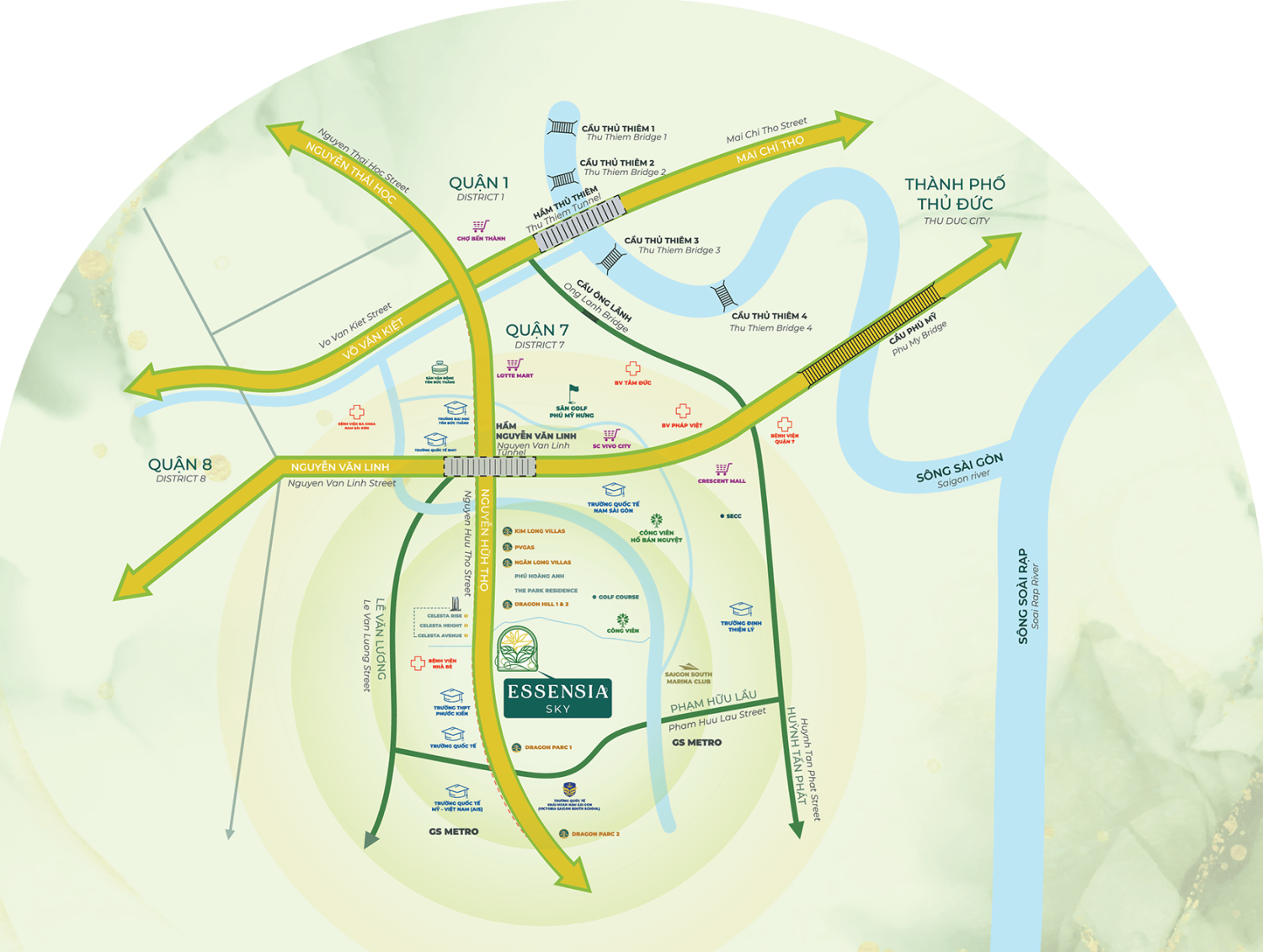 Trong tương lai, nơi Essensia Sky toạ lạc sẽ ngày càng phát triển, nằm kề hệ thống giao thông đồng bộ và hiện đại của Tp.HCM như: tuyến Metro số 4, cầu vượt ngã tư Nguyễn Văn Linh – Nguyễn Hữu Thọ,…
